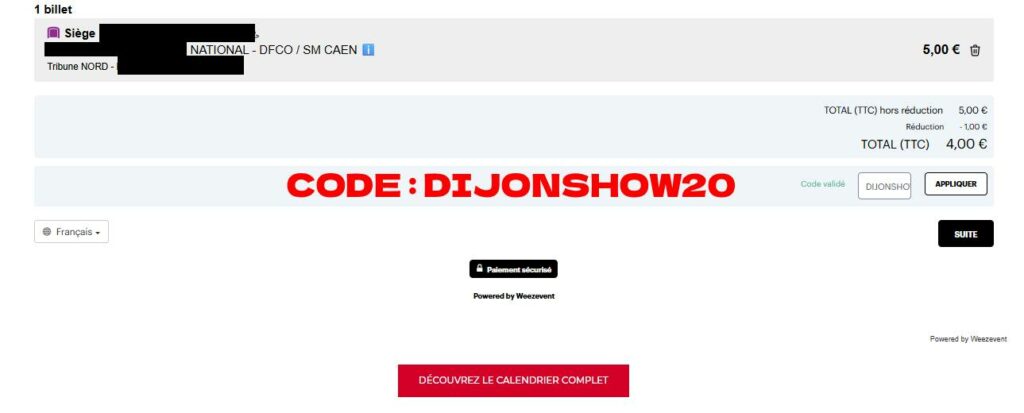 Pour cette occasion spéciale, le DFCO nous a permis de vous offrir une réduction sur les prix des billets contre Caen ! Que vous n’ayez pas encore pris votre place ou que vous vouliez convaincre de la famille, des amis ou des collègues de vous accompagner, cette offre est faite pour vous : profitez de 20% de réduction sur le prix du billet sur la billetterie en ligne du DFCO avec le code DIJONSHOW20 après avoir choisi vos sièges, au moment de procéder au paiement.